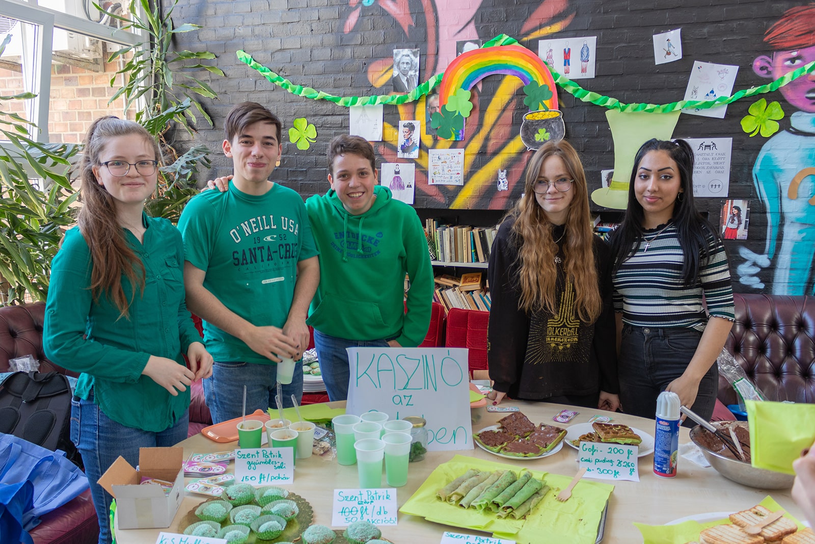 Március 17-én Szent Patrik napot ünnepeltünk a suliban. A csócsónál megannyi édességgel és étellel találkozhattank iskolapolgáraink. Valamint nyereménnyel teli kaszinó is volt az alagsorban.
